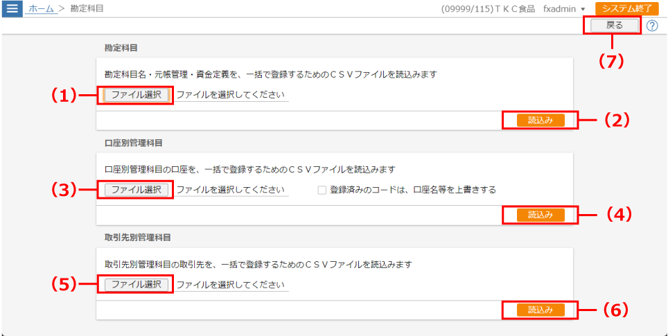 この画面では、勘定科目情報を一括で修正するためのCSVファイルを読込むことができます。