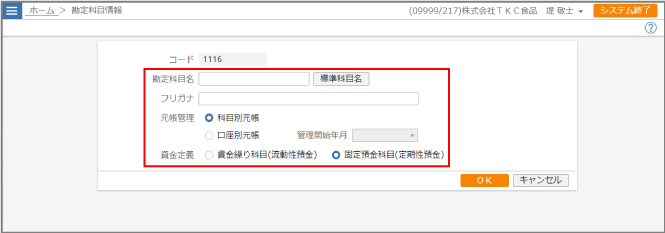 [勘定科目名]、[フリガナ]、[元帳管理]、[資金定義]を入力します