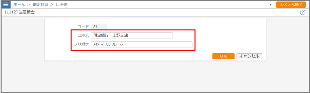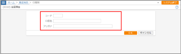 項目 内容 コード コードを入力します。 A~Wまでの半角英字1文字、A0~W9までの半角英字1文字+半角数字1文字、00~99までの半角数字2文字のいずれかで入力してください。口座名 口座名を全角20文字(半角40文字)以内で入力します。 フリガナ 口座名のフリガナを全角25文字(半角50文字)以内で入力します。 -