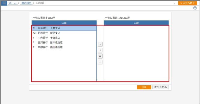 (削除)ボタン選択した口座を[一覧に表示する口座]から削除します。