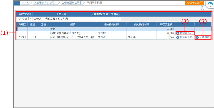 回収予定日、入金元名、元帳残高が表示されます。また、該当する回収予定日、入金元の予定明細が表示されます。