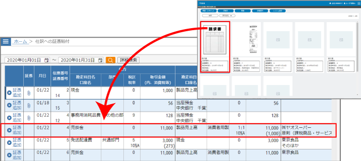 貼付したい証憑を選択し、貼付先の仕訳にドラッグ&ドロップします