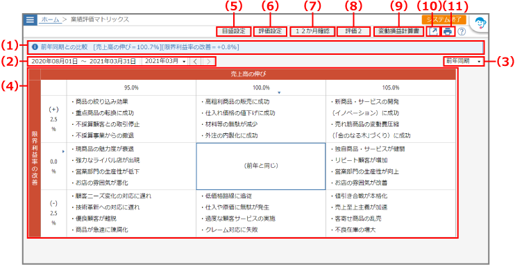 | (1) | メッセージ | 業績評価マトリックスの比較値や、各種メッセージが表示されます。 |