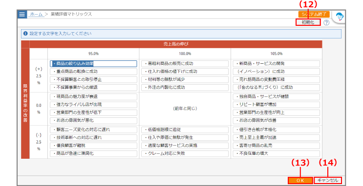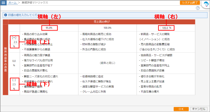 | (5) | [目盛設定]ボタン | クリックすると、目盛の設定モードになります。 目盛値を変更できます。目盛値は、業績評価マトリックスで業績を比較する際の基準値となります。 |