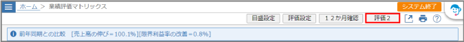 1[評価1]/[評価2]ボタンをクリックして、評価設定を変更する業績評価マトリックスを選択します