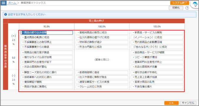 ここでは、業績評価マトリックスの目盛設定・評価設定を変更する方法を説明します。