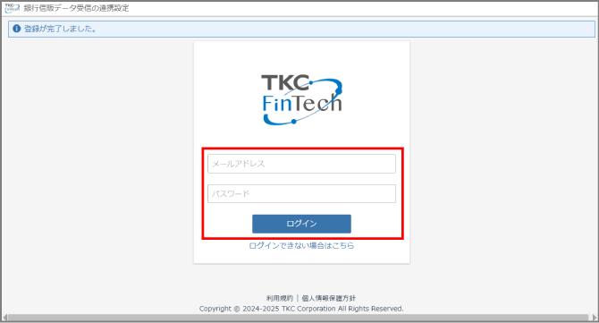 TKCFinTechサービスのユーザIDとパスワードを入力し、[ログイン]ボタンをクリックします。