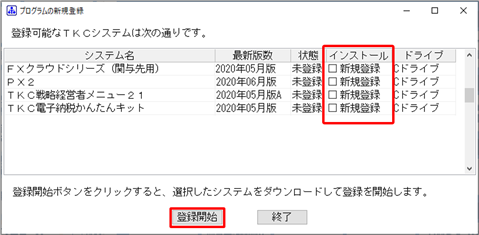 [FXクラウドシリーズ(関与先用)]と他に登録するシステムの[新規登録]にチェックを付け、[登録開始]ボタンをクリックします