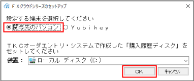 [関与先のパソコン]にチェックを付け、購入履歴ディスクをセットした装置を選択し、[OK]ボタンをクリックします