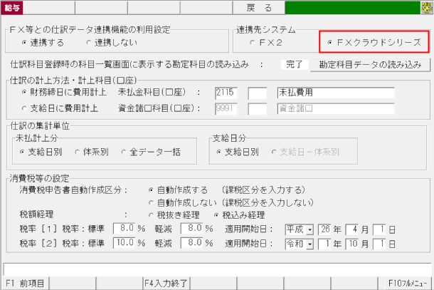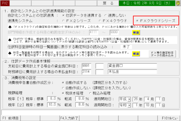 [会社情報タブ]>[7 仕訳情報]で、[連携先システム]を「FXクラウドシリーズ」に変更します。