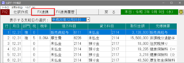 [34 仕訳データの作成]で仕訳作成後、画面上部の[FX連携]ボタンをクリックします。