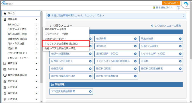 FXクラウドシリーズの[財務会計]>[仕訳データの読込]>[TKCシステム自動仕訳の読込]をクリックします。