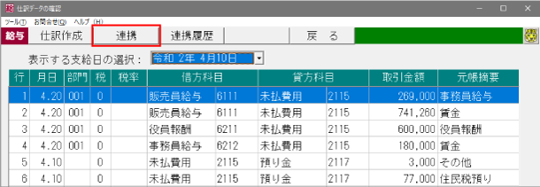 [給与仕訳の確認とFXクラウドシリーズへの仕訳計上]で仕訳作成後、画面上部の[連携]ボタンをクリックします。