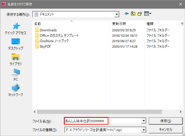 任意の場所に「あんしん給与仕訳yyyymmdd.zip」を保存します。(「yyyymmdd」は、zipファイルを作成した日付)