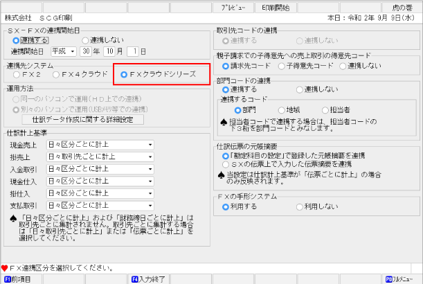 「会計事務所専用」からSX2を起動し、[2 運用開始後の支援処理]>[6 FX連携機能の設定]で、[連携先システム]を「FXクラウドシリーズ」に変更します。