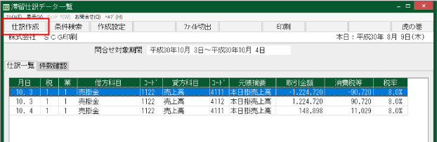 [補助機能]タブ>[1 滞留仕訳データ一覧]で、画面上部の[仕訳作成]ボタンをクリックします。