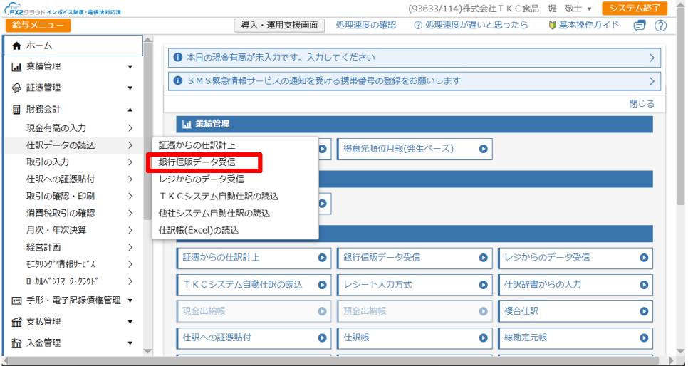 「銀行信販データ受信」メニューをクリックします。