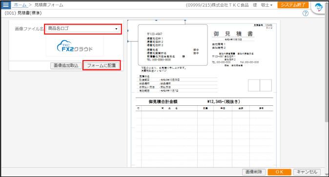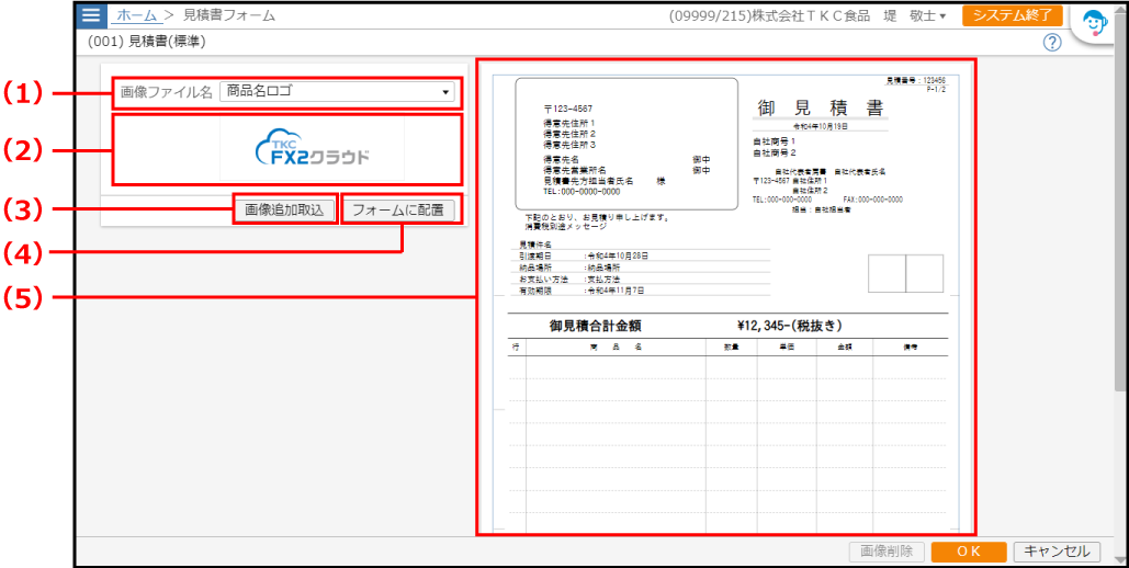 | (4) | [フォームに配置]ボタン | 選択した画像ファイルを見積書に配置します。 配置した画像ファイルは(5)に表示されます。 |