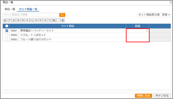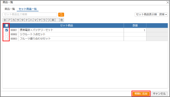 4追加するセット商品にチェックを付けて、[明細に追加]ボタンをクリックします